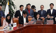 최근 청와대 국정감사에서 고함을 질러 논란이 된 강기정 대통령정무수석비서관이 결국 정국의 걸림돌이 됐다. 내년도 예산안 심사를 위해 6일 국회에서 열린 예산결산특위 전체회의에 노영민 대통령비서실장을 대신해 강 수석이 출석한 것을 두고 여야가 대립을 이어가다 끝내 파행한 것. 자유한국당은 국회 모욕을 근절하기 위한 ‘강기정법’을 발의하기로 했다. 패스트트랙 협상 등 앞으로 남은 정기국회가 마비되는 것 아니냐는 우려가 나온다. 이날 오전 10시로 예정됐던 예결특위는 한국당 소속인 김재원 예결특위원장을 비롯해 한국당 의원들이 단체로 불참하면서 개회가 미뤄졌다. 한국당과 바른미래당은 노 실장이 직접 회의에 출석해 사과할 것과 강 수석의 해임을 요구했다. 한국당 나경원 원내대표는 최고위원·중진의원 연석회의에서 “강 수석이 국회에 오는 것은 더 이상 무의미하다”고 했다. 바른미래당 예결특위 간사인 지상욱 의원도 국회 예결특위 회의장 앞에서 “비서실장이 나와 사과하고 마무리 짓는 게 맞다”고 했다. 강 수석은 회의장 밖에서 기자들과 만나 “(여야) 3당 간사들이 오라고 해서 제가 왔다”고 해명했다. 그는 “정의용 청와대 국가안보실장과 나 원내대표의 발언 속에 끼어든 것은 제가 백 번 잘못했다”고 고개를 숙이면서도 국감 당일 충분히 사과했다고 강조했다. 그러면서 피감기관의 답변을 자르거나 답할 기회조차 주지 않는 국감 행태에 대한 쓴소리도 쏟아냈다. 3선 국회의원 출신인 그는 “피감기관과 의원의 위치를 바꿔 놓고 역지사지로 보니 5년 전, 10년 전과 변화가 없다”고 했다. 이어 “(정무수석이) 국회 청와대 왔다 갔다 하는 시계추가 아니지 않으냐”며 “제가 소리친 건 잘못된 게 분명한데 이걸 핑계로 국회가 또 공전될까 아쉬움이 남는다”고도 했다. ‘나 원내대표를 찾아갈 계획은 있느냐’는 질문에는 “국회 오지 말라는데 찾아가면 오히려 어깃장 놓는 거다. 사람이 마음 풀리고 필요하면 찾아뵈어야지”라고 했다. 청와대 국감에서 정 실장이 북한의 대륙간탄도미사일(ICBM)을 이동식발사대(TEL)에서 발사하기 어렵다고 한 답변을 두고 야당이 반발하는 데에 대해서는 “안보 논쟁에서 정부 논리를 부인해버리면 답이 없다”고 했다. 그는 “국가안보실장, 서훈 국가정보원장, 국방장관 모두 공통 의견을 냈다”며 “아무리 야당 입장에서 다른 생각 있더라도 공식 발언을 받아주셔야 한다”고 했다. 이날 청와대는 야당의 해임 요구를 일축했다.김지현 jhk85@donga.com·이지훈 기자}