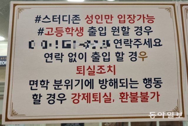 ‘스터디존 성인만 입장가능’ 9일 서울 관악구 A스터디카페. 이 카페 입구에는 성인만 출입 가능하다는 내용의 안내문이 붙어 있다. 이 스터디카페는 3개월 전부터 중고교생의 학습공간 출입을 제한하고 있다. 학생들이 시끄럽다는 성인 이용자들의 민원이 많았기 때문이다. 고교생은 따로 점주에게 연락을 한 뒤 면학 분위기를 망치지 않겠다고 약속해야 학습공간에 들어갈 수 있다. 부모의 동의도 필수다. A스터디카페 점주는 “시끄럽게 하는 중고생들 때문에 성인 이용자들 매출이 급격히 떨어져 어쩔 수 없이 취한 조치”라고 말했다. 스터디카페의 ‘중고교생 출입 불가‘ 현상이 최근 전국에서 나타나고 있다. 서울 노원구, 성북구, 경기 남양주시, 파주시, 경북 포항시, 울산 등에서 중고교생을 출입금지하는 스터디카페가 늘고 있다. 경기 남양주시에서 B 스터디카페를 운영하는 점주 김모 씨는 “올해 중학생 20명에게 환불을 해 줬다”고 말했다. 스터디카페에서 취업 준비를 하는 이모 씨(24·여)는 “스터디카페 내부 게시판에 보면 ‘중고생들 때문에 시끄럽다’는 항의성 쪽지가 많이 붙어있다”며 “학생들이 몰려와 떠들면 집중이 안 될 때가 많아 솔직히 화가 난다”고 말했다. 원래 중고생은 스터디카페의 주요 고객이었다. 그러나 최근 성인 대상 매출 비율이 늘어나면서 이러한 조치가 늘고 있다. 학생 고객을 받지 않아도 매출에 큰 타격이 없기 때문이다. 서울 노원구에서 C스터디카페를 운영하는 점주는 “중고생은 학교가 끝난 오후 시간부터 오지만 성인은 오전에 와서 하루 종일 머무르는 경우가 많다”며 “학생 고객을 받으면 이들을 피해 성인 고객이 다른 곳으로 옮겨가기 때문에 성인 고객만 받는 게 매출로는 이득”이라고 설명했다. 하지만 갑자기 출입금지 대상이 된 중고교생의 불만은 커지고 있다. 그동안 공부하던 장소가 일시에 사라졌기 때문이다. 울산의 중학생 김모 양(15)은 “학교 근처 스터디카페를 다니려고 알아봤는데 중학생 출입금지라 등록하지 못한 적이 있다”며 “일부 학생들이 시끄럽다는 이유로 모든 학생을 안 받는 건 부당하다”고 말했다. 경기 안양시의 고모 양(17) 역시 “시끄러운 학생이 있다면 그 사람에게 경고를 하거나 퇴장시켜면 되는 건데 모든 학생을 받지 않는 건 옳지 않다”고 목소리를 높였다. 전문가들은 이런 현상이 청소년에 대한 편견을 더 강화시킬 수 있다고 우려한다. 김종영 경희대 사회학과 교수는 “‘중고교생 출입금지 조치가 ‘학생들은 시끄럽고 무질서하다’는 부정적 낙인효과를 만드는 차별이 될 수 있다”고 진단했다. 장경은 경희대 아동가족학과 교수는 “중학생이나 고교생은 발달 단계상 미성년이라 사회 질서나 규칙을 배워가는 시기”라며 “다른 이들과 함께 이용하는 장소의 규칙와 규범을 배우고 습득할 수 있도록 어른이 가르쳐 주는 게 바람직하다”고 말했다.조유라기자 jyr0101@donga.com소설희 인턴기자 이화여대 국어국문학과 졸업}