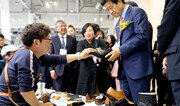 2일 부산 해운대구 벡스코 제1전시장에서 열린 ‘2017 부산국제신발패션섬유전시회’를 찾은 방문객들이 수제화 명장 1호 유홍식 씨(왼쪽 앉은 사람)의 신발 공방 부스를 둘러보고 있다. 17회째인 이번 전시회는 4일까지 열린다. 국내외 신발, 섬유, 패션업체 314개사가 참가했다. 박경모 기자 momo@donga.com}