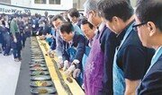 8일 부산 해운대구 벡스코 제1전시장에서 열린 ‘2017 부산국제수산무역 EXPO’에서 참가업체 대표, 해외바이어들이 ‘수산물 김밥 말기’ 퍼포먼스를 하고 있다. 국내 유일의 수산무역 전시회인 이번 엑스포에는 세계 20여 개국에서 401개사가 참가해 사흘간 수산식품과 기자재, 해양바이오제품을 선보인다. 박경모 기자 momo@donga.com}