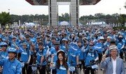 31일 오전 서울 송파구 올림픽공원 평화의문 광장에서 인천 아시아경기대회의 성공을 기원하기 위해 열린 ‘2014 포카리스웨트 블루로드 캠페인’에 참여한 시민 2500여 명이 도심 자전거 라이딩을 시작하기 전 파이팅을 외치고 있다. 최혁중 기자 sajinman@donga.com}