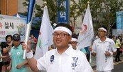 ‘아시아 비출 성화 인천의 품으로.’ 아시아경기 발상지인 인도 뉴델리와 강화도 마니산에서 채화된 뒤 국내에서 하나로 합쳐져 전국을 누볐던 인천 아시아경기 성화가 17일 인천에 입성했다. 성화를 든 봉송 주자가 인천 원인재역 앞을 지나고 있다. 인천=최혁중 기자 sajinman@donga.com}