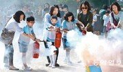 서울 서초구 서울교대부속초등학교에서 열린 ‘엄마와 함께하는 어린이 안전교육’ 현장에서 학부모와 어린이들이 소화기를 실제로 작동해 보며 사용법을 배우고 있다. 최혁중 기자 sajinman@donga.com}