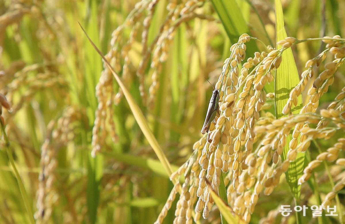 가을이 깊어가는 가운데 충북 청주시 현도면의 황금 들녘 벼 위에 메뚜기가 앉아 있다. 김태영 기자 live@donga.com}
