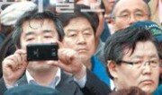 10일 서울 서대문구 창천동 현대백화점 신촌점 앞에서 열린 새누리당 마포-서대문구 합동유세장에 참석한 유권자들. 한 시민이 유세단 방향으로 사진을 찍고 있다. 김동주 기자 zoo@donga.com}