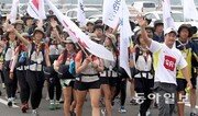 5일 오후 ‘희망풍차 SR 나눔로드’에 참여한 대학생 129명이 서울 마포대교를 걷고 있다. 마라도에서 임진각까지 674km를 걷는 이 행사는 7월 22일부터 16박 17일 일정으로 진행 중이다. 최혁중 기자 sajinman@donga.com}