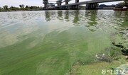 14일 전남 나주시 다시면 죽산보의 영산강물이 짙은 녹색을 띠고 있다. 기록적인 폭염과 가뭄으로 전국 주요 상수원마다 녹조가 빠르게 확산되고 있다. 낙동강 창녕함안보에도 녹조가 심각해 이 지역 식수원 관리에 비상이 걸렸다. 나주=박영철 기자 skyblue@donga.com}