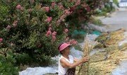 16일 전남 구례군 산동면에 붉은 백일홍이 만개한 가운데 한 주민이 백일홍 나무 아래서 잘익은 참깨를 널어 말리고 있다. 박영철 기자 skyblue@donga.com}