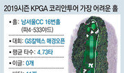 올 시즌 한국프로골프(KPGA) 코리안투어에서 가장 난도가 높았던 홀은 경기 성남 남서울CC 16번홀로 나타났다. 30일 한국프로골프협회가 올 시즌 대회가 열린 코스의 홀별 난이도를 분석한 결과 GS칼텍스 매경오픈이 열린 남서울CC(파71) 16번홀(파4·533야드)의 전체 출전 선수 평균 타수가 4.73타로 조사됐다. 대회 기간 이 홀에서 버디는 11개에 불과했고, 186개의 보기, 35개의 더블보기가 나왔다. 트리플보기 이상도 23개나 쏟아졌다. 그린 적중률은 15.68%에 그쳤다. 남서울CC 16번홀은 2017년부터 3년 연속 국내 프로대회 최고 난도 홀로 꼽혔다. 이 홀은 평소 파5홀로 운영되지만 대회 때 파4홀로 변경된다. 2016년 매경오픈까지는 548야드의 파5홀이었지만 2017년부터 15야드가 짧아진 파4홀로 변경되면서 까다롭기로 소문난 홀이 됐다. 한연희 전 골프대표팀 감독은 “전장이 긴 데다 페어웨이가 좁고 중간에 2.7m 깊이의 벙커까지 있어 티샷이 무척 어렵다. 세컨드 샷은 보통 내리막 경사에서 롱아이언으로 쳐야 하는데 런이 많이 발생해 그린에 공을 세우기 쉽지 않다”고 말했다. 올해 매경오픈 우승자인 이태희는 최종 라운드 16번홀에서 보기를 범했지만 1, 2, 3라운드에서는 파를 지켜냈다. 두 번째로 어려운 홀은 코오롱 한국오픈이 열린 충남 천안 우정힐스CC 11번홀(파4·501야드)로 평균 4.49타를 기록했다. 반면 가장 쉬웠던 홀은 휴온스 엘라비에 셀러브리티 프로암이 열린 인천 드림파크CC 파크코스 12번홀(파5·552야드)이었다. 평균 4.48타가 나온 이 홀에서 대회 기간 14개의 이글과 197개의 버디가 나왔다. 그린 적중률은 87.98%.정윤철 기자 trigger@donga.com}
