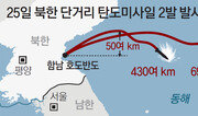 지난달 말 판문점 북-미 정상 회동 이후 미국의 실무협상 요구에 응하지 않으면서 한국의 쌀 지원도 거부한 북한이 25일 ‘미사일 무력시위’를 전격 강행했다. 청와대는 북한의 미사일 발사 약 13시간 만에 “새로운 종류의 단거리탄도미사일”이라고 발표했다. ‘탄도미사일’로 신속히 규정해 탄도미사일 기술을 이용한 북한의 모든 발사 행위를 금지한 유엔 안전보장이사회 대북 결의(1874호)를 위반했다는 것을 명확히 하면서도 ‘단거리’라는 단서를 달아 추가 제재에 나설지에 대해선 여지를 남긴 것이다. 군 당국에 따르면 25일 오전 북한 함경남도 호도반도에서 단거리미사일 2발이 동해상으로 잇달아 발사됐다. 오전 5시 34분경에 발사된 1발은 430여 km를 날아갔고, 오전 5시 57분경에 쏴 올린 나머지 1발은 690여 km를 비행한 것으로 파악됐다고 군은 전했다. 두 번째 미사일은 직선거리로 따지면 제주를 포함한 한반도 전역, 그리고 일본 서쪽 주고쿠(中國) 지방까지 닿는다. 북한의 미사일 발사는 5월 9일 평안북도 구성 일대에서 KN-23 신형 단거리탄도미사일(SRBM)을 발사한 이후 77일 만이다. 최근 잠수함발사탄도미사일(SLBM)을 확충한 신형 잠수함 공개에 이어 한미 양국을 겨냥한 북한의 ‘강공 드라이브’가 본격화된 것으로 보인다. 청와대는 25일 오후 정의용 청와대 국가안보실장 주재로 국가안전보장회의(NSC)를 연 뒤 서면 자료를 통해 “북한이 발사한 발사체가 새로운 종류의 단거리탄도미사일인 것으로 분석됐다”면서 “향후 한미 간 정밀평가를 통해 최종 판단하기로 했다”고 밝혔다. 이어 “이러한 북한의 행위는 한반도에서의 군사적 긴장 완화 노력에 도움이 되지 않는 것”이라고 했다. 이에 앞서 청와대는 한정우 부대변인의 서면 브리핑을 통해 “문재인 대통령은 상황 발생 즉시 국가안보실로부터 보고를 받았다”며 “정부는 관련 동향을 예의 주시해 왔으며 유관 부처 간 신속한 대응체계를 가동 중”이라고 설명했다. 한편 청와대는 “NSC에서 최근 중동 정세에 대해 논의하고, 호르무즈 해협에서 우리 민간 선박들의 안전한 항해를 보장하기 위한 방안들을 검토했다”고 했다. 또 “23일 러시아 군용기의 영공 침범과 관련하여 우리 정부의 단호한 입장을 재확인했다”고 전했다.윤상호 군사전문기자 ysh1005@donga.com·한상준 기자}