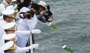 대한해협해전 전승 67주년을 맞아 26일 해군 장교들이 4400t급 해군 구축함인 문무대왕함을 타고 부산 앞바다에서 전사자를 추모하며 바다에 헌화하고 있다. 대한해협해전은 6·25전쟁이 발발한 다음 날인 1950년 6월 26일 해군 최초의 전투함인 백두산함이 부산으로 침투하던 1000t급 북한 무장수송선을 침몰시킨 전투다. 박경모 기자 momo@donga.com}