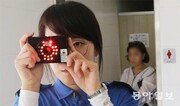 24일 부산 해운대해수욕장 공영화장실 입구에서 해운대여름경찰서 소속 여경이 몰카 탐지장치를 이용해 불법 초소형 카메라가 설치됐는지를 살펴보고 있다. ‘렌즈 탐지기’로 불리는 이 장비는 적외선을 쏜 뒤 몰카 렌즈에서 반사되는 빛으로 카메라를 찾아내는 방식이다. 부산=박경모 기자 momo@donga.com}