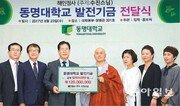 대한불교 조계종 해인정사(부산 사하구 괴정동) 주지 수진 스님(오른쪽에서 네 번째)이 23일 부산 동명대 정홍섭 총장에게 대학 발전기금 1억2000만 원을 전달했다. 수진 스님은 “동명대가 전국 최초로 불교문화학과를 개설해 불교문화의 중흥과 한국 불교의 세계화에 도움이 됐으면 한다”고 기부 이유를 밝혔다. 박경모 기자 momo@donga.com}