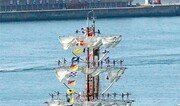 28일 부산 해군작전사령부에 입항하는 멕시코 훈련함 쿠아우테목함(1800t급)의 여러 활대 위에 승조원들이 줄지어 서있다. 범선 형태의 함정이 다른 나라에 입항할 때 관례적으로 하는 인사다. 쿠아우테목함은 길이 67.2m, 폭 12m로 사관생도 50여 명을 포함해 승조원 200여 명이 승선했다. 범선 형태지만 1125마력 디젤엔진으로 움직인다. 이번 방문은 멕시코 해군사관생도 순항 훈련 중 이뤄졌다. 한국 해군사관학교와의 교류 활동 등을 마치고 다음 달 1일 출항한다. 부산=박경모 기자 momo@donga.com}