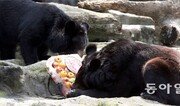 반달가슴곰들이 27일 경기 과천시 서울대공원에서 열린 ‘반달가슴곰의 시원한 여름나기’ 행사에서 어린이들이 만든 과일빙수를 선물받아 먹고 있다. 앞서 환경부는 25일 반달가슴곰과 수달, 미선나무, 왕오색나비 등 4종을 제12차 생물다양성협약 당사국총회 홍보대사로 위촉했다. 총회는 9월 29일부터 10월 17일까지 강원 평창 알펜시아리조트 일대에서 열린다. 과천=박영대 기자 sannae@donga.com}