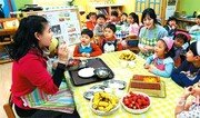 ‘열린 어린이집의 날’인 11일 서울 강동구 고덕리엔파크아파트 어린이집에서 엄마들이 아이들에게 요리를 가르치고 있다. 서울시는 이달부터 매월 둘째 주 수요일을 학부모가 교사로 참여하는 ‘열린 어린이집의 날’로 정했다. 전영한 기자 scoopjyh@donga.com}