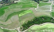 24일 전남 구례군 산동면 지리산의 층층이 겹쳐진 다랑논이 서서히 녹색으로 물들어가고 있다. 드론을 통해 내려다본 풍경이 한층 더 이색적이다. 박영철 기자 skyblue@donga.com}