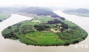 11일 전남 나주시 동강면의 영산강을 굽이쳐 흐르는 곳에 한반도 모양의 지형인 느러지에 신록이 푸르게 우거져 이색풍경을 보여주고 있다. 박영철 기자 skyblue@donga.com}