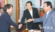 4·24 재·보궐선거 당선 동기인 무소속 안철수, 새누리당 김무성, 이완구 의원(왼쪽부터)이 17일 서울 여의도의 한 식당에서 오찬 회동을 갖기 전 악수를 하고 있다. 안 의원은 기자들과 만나 “문 의원과는 소주 얘기를 한 적이 없다”고 했다. 전날 문재인 의원이 기자들과 등산을 하면서 “안 의원에게 ‘언제 소주 한잔하자’고 제안했다”고 밝힌 데 대해 사실이 아니라고 반박한 것이다. 박영대 기자 sannae@donga.com}