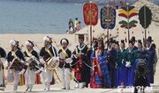 6월 1일부터 12월 30일까지 해운대그랜드호텔 전용극장에서 공연하는 국립부산국악원 상설공연 ‘왕비의 잔치’ 시즌3 출연진들이 공연복장을 한 채 해운대해수욕장 주변에서 홍보 퍼레이드를 펼치고 있다. 박경모 기자 momo@donga.com}