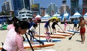 11일 부산 해운대해수욕장 일원에서 열린 ‘2017 한국해양레저쇼’에서 참가자들이 패들보트를 타기 전 육상에서 연습하고 있다. 박경모 기자 momo@donga.com}