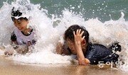 18일 부산 해운대해수욕장에서 어린이 두 명이 파도를 맞으며 더위를 쫓고 있다. 이날 경남 합천이 최고기온 36.5도를 기록해 역대 6월 최고기온 기록을 경신하는 등 한여름 같은 더위가 이어져 전국 곳곳에 폭염특보가 발령됐다. 기상청은 한동안 맑은 날씨가 계속돼 특보가 확대될 가능성이 있다고 밝혔다. 19일 한낮 기온은 서울 32도, 광주 34도, 합천 35도로 예보됐다. 부산=박경모 기자 momo@donga.com}