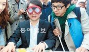 무소속 안철수 대선후보가 28일 서울 중구 서울광장에서 열린 ‘2012 서울 북페스티벌’에서 저시력 안경을 쓴 채 점자책을 읽으며 시각장애인의 어려움을 체험하고 있다. 박영대 기자 sannae@donga.com}