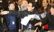 중앙선거관리위원회가 인터넷과 야권 일각에서 제기하는 제18대 대선 개표 부정 의혹과 관련해 17일 국회 대강당에서 개표 시연회를 열었다. 이날 시연회에서 일부 시민단체 회원이 개표 부정 의혹을 주장하는 자료를 내보이며 선관위 측에 강하게 항의하고 있다. 일부 방청인과 이를 막는 국회 경위들 사이에 몸싸움이 벌어지기도 했다. 박영대 기자 sannae@donga.com}