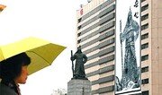 서경덕 성신여대 교수와 이상봉 패션디자이너가 함께한 ‘대한민국 영웅 프로젝트’ 제2탄의 주인공인 충무공 이순신의 대형 걸개그림이 충무공 탄신일을 하루 앞둔 27일 서울 종로구 광화문광장 옆 KT사옥 외벽에 걸려있다. 박영대 기자 sannae@donga.com}