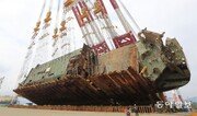 7일 전남 목포신항에 있는 세월호 선체를 바로 세우기 위해 1만 t급 해상 크레인 ‘현대 만호’(HD-1000)가 세월호 옆에 접안해 있다. 세월호를 바로 세우는 ‘직립작업’은 10일 목포신항 부두에서 이뤄진다. 박영철 기자 skyblue@donga.com}