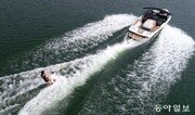 전남 영광군 불갑저수지에서 28일 수상스키 대회에 출전한 선수 및 동호회원들이 시원하게 물살을 가르며 수상스키를 타고 있다. 박영철 기자 skyblue@donga.com}