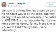 2차 북미정상회담을 위해 베트남 하노이를 방문중인 도널드 트럼프 미국 대통령이 27일(현지시간) 김정은 북한 국무위원장을 ‘내 친구’로 지칭하며 비핵화에 따른 북한의 잠재적 경제 성장 전망을 강조했다.트럼프 대통령은 이날 트위터에 “베트남처럼 이 지구상에서 번성하고 있는 곳도 거의 없다”며 “만약 북한이 비핵화를 한다면 북한의 발전 역시 똑같이 매우 빠를 것”이라고 기대했다.이어 “그 잠재력은 내 친구 김정은에게 유래를 찾아볼 수 없을 정도로 어마어마한 기회다”며 “우리는 곧 무슨 일이 일어날지 알게 될 것이다. 매우 흥미롭다!”고 적었다.특히 트럼프 대통령은 ‘어마어마한’(AWESOME)이라는 단어를 대문자로 표기해 강조했다.이어진 트윗에서는 민주당을 향해 비판의 날을 세웠다. 그는 “민주당은 내가 북한과 무엇을 해야 하는지에 대해 이야기 하는 것을 멈추고, 오바마 행정부 8년 동안 자신들은 왜 그일(대북 협상)을 하지 않았는지 스스로에게 물어야 할 것이다”고 덧붙였다.트럼프 대통령은 이날 오후 6시30분(한국시간 오후 8시30분) 하노이 메트로폴 호텔에서 김 위원장과 만난다. 두 정상은 약 20분간 단독(one-on-one)회담을 갖고, 7시부터 8시 35분까지 호텔에서 만찬을 갖는다.박태근 동아닷컴 기자 ptk@donga.com}