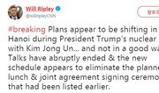 도널드 트럼프 미국 대통령과 김정은 북한 국무위원장의 협상이 중도에 결렬됐다는 소식이 전해진 가운데, 현지에서 취재중인 CNN 기자는 "하노이와 워싱턴에서 큰 혼란이 일어났다"고 전했다.CNN 북한담당 윌 리플리 기자는 28일 오후 트위터에 "회담은 갑작스럽게 끝났고 당초 예정됐던 오찬과 공동 서명식은 취소" 됐다며 "회담이 좋지 않은 식(not in a good way)으로 나타났다"고 전했다.이어 "백악관은 양 정상의 합의가 이뤄지지 않았다고 밝혔다"며 "트럼프 대통령과 김 위원장은 빈손으로 회담장을 떠났다. 한 소식통은 하노이와 워싱턴에서 ‘큰 혼란’이 일어났다고 했다"고 전했다.이날 트럼프 대통령과 김 위원장은 확대회담 후 예정됐던 오찬과 공동 서명식 없이 바로 각자의 숙소인 JW 메리어트 호텔과 멜리아 호텔로 돌아갔다.박태근 동아닷컴 기자 ptk@donga.com}