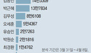 ‘김종인의 선거에서 문재인의 선거로….’ 4·13총선이 막바지에 접어들면서 소셜네트워크서비스(SNS)상의 더불어민주당 표심이 김종인 비상대책위원회 대표에서 문재인 전 대표로 이동한 것으로 나타났다. 동아일보가 소셜 빅데이터 분석업체인 스토리닷과 공식 선거운동이 시작된 3월 31일부터 이달 8일까지 트위터와 블로그 등 SNS상에서 여야 주요 인물을 언급한 글을 분석한 결과 문 전 대표가 이 기간 52만1408건이 거론되며 1위를 차지했다. 문 전 대표가 ‘야권의 심장’인 광주를 찾은 8일엔 하루 동안 16만93건이나 언급됐다. 특히 더민주당과 짝을 이룬 연관어에서도 문 전 대표는 1위(11만9554건)에 오른 반면 김 대표는 10위권에도 들지 못했다. 김 대표는 공천 과정에서 당내 절대 권위로 ‘차르(황제)’라고 불렸다. 하지만 김 대표는 비례대표 공천 갈등을 빚은 데다 총선 유세에 돌입하며 대중 동원력에서 ‘체급’이 다른 문 전 대표가 전면에 등장하자 존재감이 약화된 것으로 보인다. 문 전 대표 다음으로 관심을 받은 인물은 국민의당 안철수 상임공동대표(30만2457건)였다. 안 대표와 국민의당은 선거운동 막판 언급량에서 모두 지속적인 상승세를 타고 있다. 반면 2004년 17대 총선 이후 ‘선거의 여왕’ 자리를 지키던 박근혜 대통령(4위·13만7834건)과 새누리당 김무성 대표(5위·8만6108건)는 SNS상의 관심에서 다소 밀렸다. 박 대통령이 지난달 30일부터 6박 8일 해외 순방으로 선거 이슈에서 멀어진 것도 영향을 미친 것으로 보인다. 스토리닷 유승찬 대표는 “문 전 대표의 언급량이 많은 게 긍정적인 결과로 이어질지는 미지수”라며 “김종인 대표를 끌어들인 효과가 반감될 가능성도 있다”고 분석했다.홍수영 기자 gaea@donga.com}