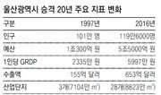 15일이면 울산시가 광역시로 승격된 지 20년을 맞는다. 경남 울산시에서 울산광역시로 바뀐 1997년 7월 15일 시민들은 “울산이 생긴 이래 가장 큰 경사”라며 기뻐했다. 시가지는 환영 플래카드로 넘쳤고 축하 행사도 줄을 이었다. 김모 씨(55·중구)는 “울산에 살면서 20년 전 광역시 승격일의 감동을 지금도 잊을 수 없다”고 말했다. 광역시 출범 20년 만에 울산은 도시와 경제 규모, 환경과 문화, 복지를 비롯한 거의 모든 분야에서 획기적으로 발전했다. UNIST(울산과학기술원)와 고속철도(KTX) 울산역도 생겼다. 울산시와 각 구군은 광역시 승격 20주년을 기념하고 발전을 다짐하는 다양한 행사를 이날을 전후해 마련한다. 시는 13일 오후 2시 대강당에서 1000여 명이 참석한 가운데 ‘2040 비전 선포 및 브랜드 슬로건 공개’ 행사를 연다. 광역시 승격 43주년이 되는 2040년을 바라보며 울산의 비전을 선포하는 행사다. 시청 본관 1층 로비에서는 기념 사진전이 열린다. 이에 앞서 이날 오전 11시 반부터는 문수컨벤션에서 김기현 울산시장 주재로 광역시 승격 공로자 초청 오찬을 한다. 심완구 전 울산시장과 김성렬 전 울산시의회 의장을 비롯해 100여 명이 참석한다. 각 구군의 행사도 다양하다. 울산 북구는 14일 오전 10시 북구 문화예술회관 공연장에서 출범 20주년 기념식을 연다. 자매도시인 베트남 롱쑤엔시 대표단도 참석한다. 제1회 구민대상 시상식과 함께 주민의 축하 메시지를 담은 영상도 상영된다. 또 ‘미래로 도약하는 드림시티 울산 북구’의 출발을 알리는 미래비전 선포식이 열린다. 이날 오후 3시 구청 대회의실에서는 ‘북구의 지속가능한 발전전략’을 주제로 북구미래비전포럼도 개최된다. 오후 7시 반 구청 광장에서는 주민과 함께하는 ‘투게더 콘서트’가 곁들여진다. 박해미와 정수라, 김정민이 출연하고 뮤지컬 갈라쇼도 선보인다. 북구문화예술회관 전시장에서는 북구의 과거와 현재를 비교해보는 사진기획전이 15일까지 열린다. 북구 ‘기네스북 2.0’ 책자도 발행될 예정이다. 남구도 자치구 승격 20주년 기념행사를 마련한다. 15일 오후 7시 반부터 태화강 둔치 특설무대에서 ‘2030 울산 남구 비전 선포식’을 연다. 남구의 자치구 승격 기념과 희망찬 미래 발전을 다짐하는 자리다. 12일부터 다음 달 20일까지 장생포 고래박물관에서는 ‘성년 울산 남구! 반세기 추억 이야기’를 주제로 기록물 전시회가 열린다. 14∼20일 태화강 둔치에서는 해피강변페스티벌이 펼쳐진다. 동구도 14일 구청 2층 대강당에서 ‘자치구 승격 20주년 기념행사’를 연다. 동구여성합창단 축하공연과 영상물 상영, 유공자 표창 수여식이 열린다. 동구의 변화를 볼 수 있는 특별사진전도 이어진다. 정재락 기자 raks@donga.com}