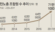지난해 전국민주노동조합총연맹(민노총)의 조합원 수가 1999년 합법화 이후 처음으로 70만 명을 돌파했다. ‘노동 존중’을 표방한 현 정부에서 세(勢) 불리기에 집중한 결과다. 국내에서 노조에 가입한 전체 조합원도 처음으로 200만 명을 넘어섰다. 20일 고용노동부에 따르면 2017년 말 기준 국내 노조원은 208만8000명으로 전년보다 12만1000명(6.2%) 증가했다. 노조 조직률(노조 가입이 가능한 근로자 중 실제 노조에 가입한 근로자 비율)은 10.7%로 전년보다 0.4%포인트 올랐다. 상급단체 중에는 한국노동조합총연맹(한국노총)이 87만2000명으로 조합원이 가장 많았다. 민노총은 71만1000명으로 뒤를 이었다. 민노총은 전년보다 6만2000명(9.6%) 늘면서 1999년 11월 합법화 이후 처음으로 70만 명을 넘어섰다. 한국노총도 조합원이 3만 명(3.6%) 증가했다. 양대 노총이 현 정부 들어 경쟁적으로 세 불리기에 나서면서 노조원이 급증한 것으로 풀이된다. 민노총의 실제 조합원은 현재 법외노조로 정부 통계에선 빠진 전국교직원노동조합(전교조·약 5만 명)과 정보기술(IT), 게임 업종 등에서 올해 새로 설립된 노조까지 포함하면 80만 명이 넘을 것으로 분석된다. 정부가 약속한 대로 국제노동기구(ILO) 핵심 협약을 비준해 해고자와 실직자의 노조 가입을 허용하면 민노총이 한국노총을 넘어 제1노총이 될 수 있다는 전망이 나온다.유성열 기자 ryu@donga.com}