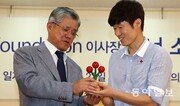 박지성(오른쪽)이 22일 서울 중구 사회복지공동모금회를 방문해 1억 원을 기부한 뒤 최신원 아너소사이어티 총대표로부터 목각으로 된 사랑의 열매 화분을 선물받고 있다. 전영한 기자 scoopjyh@donga.com}