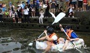 대학생 장성택 씨(25·경희대 경영학과 4학년·앞쪽)와 유성호 씨(26·공주대 전기학과 4학년)가 28일 서울 송파구 잠실한강공원에서 국산 과자봉지 160개를 붙인 ‘과자봉지 뗏목’을 만들어 한강을 건너는 퍼포먼스를 벌이고 있다. 박현수 씨(26·단국대 대학원 토목학과)와 함께 이 3명은 국산 과자의 과도한 질소 함유량을 풍자하기 위해 이 같은 이벤트를 기획했다. 이들은 오후 4시 40분경 잠실한강공원에서 출발한 지 20여 분 만에 건너편인 서울 광진구 뚝섬한강공원에 도착했다. 전영한 기자 scoopjyh@donga.com}