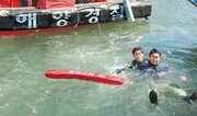 관광객이 늘어나는 봄철을 맞아 14일 전북 군산시 새만금항에서 군산해경 새만금파출소 직원과 구조대원들이 낚시객 등 관광객 조난과 실족사고를 대비한 인명구조 훈련을 하고 있다.박영철 기자 skyblue@donga.com}