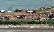 ‘한반도 8월 위기설’로 긴장이 고조되고 있는 13일 오전 인천 강화군 교동도의 한 야산에서 촬영한 휴전선 너머 북한 강변 전경. 촬영지에서 4km가량 떨어진 황해남도 연안군 지역으로 주민 200여 명이 트럭과 트랙터 10여 대를 동원해 흙을 나르거나 벽돌을 쌓아 건물을 세우는 작업을 벌이고 있다. 오전 내내 이들은 붉은 깃발을 작업장 근처에 꽂은 채 일사불란하게 공사를 했다. 주변에 텐트를 친 것으로 보아 이 작업은 수일간 이어질 것으로 보인다. 강화=양회성 기자 yohan@donga.com}