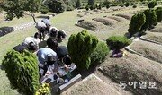 추석을 약 2주일 앞둔 17일 경기 파주시 광탄면 서울시립 용미리 제1공원묘지를 찾은 성묘객들이 조상의 묘 앞에 인사를 올리고 있다. 파주=양회성 기자 yohan@donga.com}