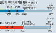 19일 뉴욕 주 경선에서 대승해 미국 공화당 대선후보 자리에 한발 더 가까워진 도널드 트럼프(70)는 언행도 점잖아졌다. 경쟁자인 테드 크루즈 상원의원(46)을 ‘거짓말쟁이 테드’라고 불러왔지만, 이날 뉴욕 맨해튼 트럼프타워에서 가진 승리 연설에선 ‘크루즈 상원의원’이라고 했다. 대선에서 맞대결할 가능성이 높아진 민주당 경선후보 힐러리 클린턴 전 국무장관도 이번엔 ‘부정직한 힐러리’라고 부르지 않았다. 그는 정제된 언어로 “우리의 일자리가 밖으로 빠져나가고 있다. 문제는 경제이고 일자리인데 이건 내 전공 분야”라고 말했다. 뉴욕타임스는 “트럼프가 딴사람 같았다. 연설하는데 대통령후보답게 들렸다”며 이는 최근 선거캠프에 합류한 폴 매너포트의 영향력이 커졌기 때문이라고 보도했다. 매너포트는 로널드 레이건, 조지 H W 부시와 그 아들인 조지 W 부시의 선거캠프를 거친 공화당 최고 선거전문가다. 아웃사이더 트럼프의 변신은 남은 경선에서 후보 지명에 필요한 매직 넘버인 1237명의 대의원을 확보하려면 좀 더 주류 후보처럼 안정적으로 보여야 한다는 전략에 따른 것이다. 그는 이날 뉴욕 주에 할당된 대의원 95명 중 92명을 챙겼다. 총 850명을 확보한 그에게 이제 매직 넘버까지 남은 대의원 수는 387명. 남은 15개 경선에서 걸린 대의원은 674명으로 평균 58%를 득표하면 산술적으로 자력으로 후보 등극이 가능하다. 각 주별로 대의원 규모와 분배 방식이 다른 만큼 ‘대형 주’에서 얼마나 선전할지가 관건이다. 26일 펜실베이니아 경선에는 71명의 대의원이 걸려 있고 부분 승자독식제다. 막바지 경선전의 최종 분수령이 될 캘리포니아(172명)도 승자가 대부분을 차지하는 방식이다. 최근 여론조사에서 트럼프는 두 곳에서 모두 이기는 것으로 나온다. 워싱턴포스트는 “트럼프의 과반 대의원 달성 가능성은 높아졌지만 아직은 위태로운 상황이다. 크루즈가 경선판을 7월 ‘중재 전당대회(brokered convention)’까지 가져가기 위해 조직 표를 더욱 가다듬을 것”이라고 전망했다. 트럼프가 과반 확보에 실패해도 ‘자유 대의원’들이 7월 전당대회에서 결선투표 격인 ‘경쟁 전당대회(contested convention)’에서 표를 몰아준다면 최종 후보 등극이 가능하다는 분석도 있다. 정치전문매체 폴리티코에 따르면 2472명의 공화당 대의원 가운데 어떤 후보에게도 매이지 않은 자유 대의원은 109명이다. 여기에 마코 루비오 상원의원을 포함해 중도에 하차한 후보들이 확보했던 180여 명도 대부분 자유의 몸이다. 트럼프는 과반 대의원 확보를 주장하면서도 경선에 출마하지 않은 제3후보까지 나서는 중재 전당대회를 염두에 두고 있다. 이날 연설에서 “크루즈는 산술적으로는 경선에서 퇴출됐다”고 주장했다. 하지만 CNN은 “트럼프가 최근 전당대회 본부장으로 임명한 매너포트를 워싱턴 의회로 보내 전대를 앞두고 공화당 하원의원들을 수시로 접촉하도록 지시했다”고 보도했다.워싱턴=이승헌 특파원 ddr@donga.com}