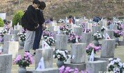 4·19혁명 59주년을 이틀 앞둔 17일 서울 강북구 국립4·19민주묘지를 찾은 학생들이 묘비 앞에서 고개를 숙여 묵념하고 있다. 이날 많은 사람이 이곳을 찾아 묘역을 청소하고 꽃과 태극기를 갈아 꽂았다. 송은석 기자 silverstone@donga.com}