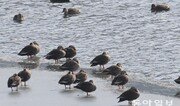 15일 전남 장성군 북하면의 장성호에서 가장자리의 얼음 위에 한 무리의 흰빰검둥오리가 한가롭게 휴식을 취하고 있다. 박영철 기자 skyblue@donga.com}