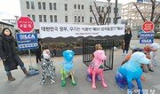 21일 광주 동구 금남로 아시아문화전당 앞 광장에서 동물보호단체 동물해방물결 회원들이 개고기 금지를 알리기 위해 꽃으로 장식한 개 조형물인 꽃개를 선보이고 있다. 박영철 기자 skyblue@donga.com}