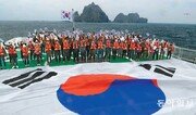 28일 해양경찰교육원 소속 3011함 갑판에서 독립유공자 후손들과 해양경찰전우회 소속 회원 등 100여 명이 손을 뻗으면 닿을 듯한 독도 앞에서 “대한독립만세”를 외치고 있다. 독도=박영철 기자 skyblue@donga.com}