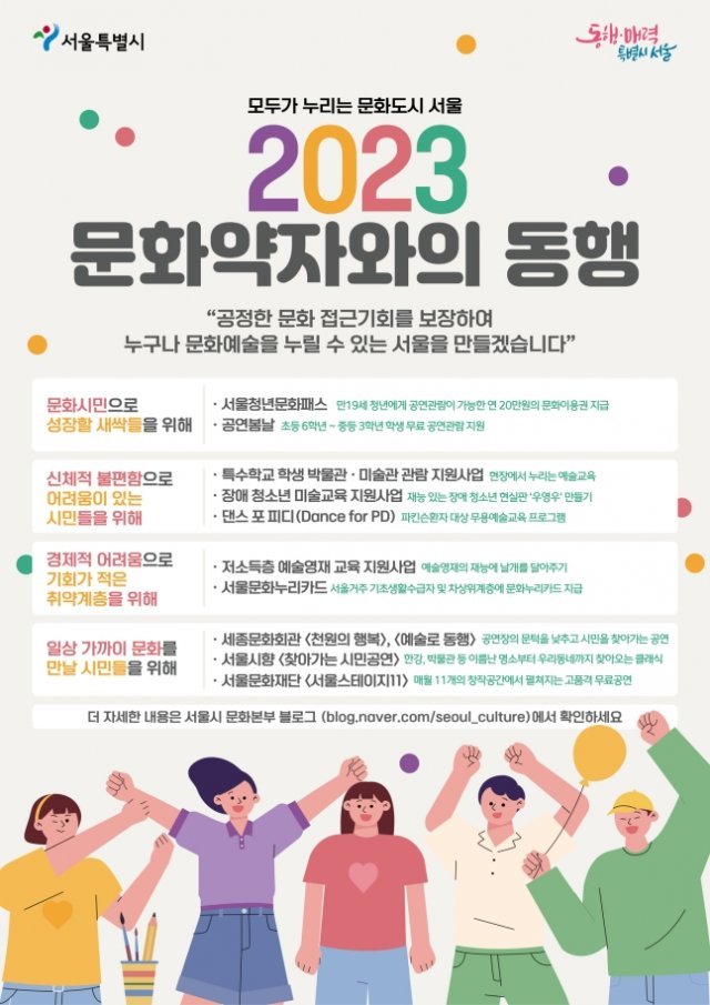 서울시가 올해부터 서울 거주 청년 약 2만8000명에게 1인당 20만 원 상당의 문화이용권을 지급한다. 특수학교 학생들이 박물관 미술관 등을 방문해 문화 체험을 할 수 있도록 버스와 전문인력을 지원하는 사업도 대폭 확대된다. 서울시는 12일 이 같은 내용이 담긴 ‘2023년 문화약자와의 동행 주요사업’을 발표했다. 문화예술 경험 기회가 부족한 ‘문화약자’ 63만 명을 지원하기 위해 18개 사업에 총 635억 원을 투입하는 내용이다. 서울시 관계자는 “역대 편성한 문화약자 예산 중 최대”라고 했다. 먼저 5월부터 중위소득(올해 4인 가구 기준 540만1000원) 150% 이하 만 19세 청년(2004년생·외국인 포함)에게 20만 원 상당의 ‘서울청년문화패스’ 바우처가 지급된다. 바우처로는 연극, 뮤지컬 등의 공연을 관람할 수 있다. 19일 오전 9시부터 ‘청년몽땅정보통’ 사이트(youth.seoul.go.kr)에서 신청하면 된다. 선정 결과는 5월 중 발표된다 지난해 시범운영을 거친 ‘특수학교 학생 박물관·미술관 관람 지원사업’도 본격 추진한다. 특수학교에 장애인 리프트 버스와 인력을 지원하는 사업인데, 올해 32개 특수학교 학생과 교원 6200명을 대상으로 진행한다. 현재 참여를 희망하는 특수학교를 접수 중이다. 기초생활수급자와 차상위계층 44만7229명에겐 1인당 연간 11만 원의 ‘서울문화누리카드’를 발급한다. 이 카드는 연말까지 세종문화회관 등 서울시내 주요 공연장 등에서 사용할 수 있다. 최경주 서울시 문화본부장은 “앞으로도 맞춤형 문화정책 설계 및 개발을 통해 모든 시민들이 장벽 없이 문화예술을 누릴 수 있는 ‘문화매력도시 서울’을 구현하겠다”고 말했다.전혜진기자 sunrise@donga.com}