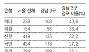 서울시내에서 시중은행 점포 10곳 중 3곳은 강남·서초·송파구 등 이른바 ‘강남 3구’에 몰려 있는 것으로 나타났다. 금융감독원이 3일 국회 정무위원회 소속 민주통합당 김기식 의원에게 제출한 국정감사 자료에 따르면 국민·우리·하나·신한·외환 등 5대 시중은행의 서울시내 점포 2037곳 중 611곳(30.0%·8월 말 기준)이 강남·서초·송파구에 속해 있었다. 은행별로는 하나은행의 강남 쏠림 현상이 가장 심했다. 하나은행의 서울 점포 236곳 중 절반에 가까운 103곳(43.6%)이 강남 3구에 있었다. 이어 외환(36.4%), 신한(32.2%), 국민(27.2%) 우리(25.1%) 순으로 강남 3구 점포 비율이 높았다. 이는 부유층이 많은 강남 3구 주민들을 고객으로 유치하기 위해 은행들이 이 지역에 점포를 집중 개설했기 때문이다. 5대 시중은행의 서울 점포 예금총액 489조8103억 원 중 27.9%인 136조6906억 원이 강남 3구 점포에 예치된 것으로 나타났다. 반면 서울 노원·도봉·강북구 등 ‘강북 3구’의 은행 인프라는 낙후된 것으로 나타났다. 강북 3구의 점포 수는 106곳(5.2%)으로 강남 3구의 5분의 1에도 못 미쳤다. 강북 3구의 점포당 예금자는 2만3130∼4만191명으로 강남 3구(1만3938∼1만7047명)보다 훨씬 많았다. 김 의원은 “같은 은행 업무라도 강남에서 5분이면 될 일이 강북에서는 10분 걸린다는 의미”라며 “예금액이 많으면 조금 기다리고, 예금액이 적으면 오래 기다리게 하는 것은 은행들의 차별적인 행태”라고 말했다. 김유영 기자 abc@donga.com}