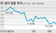 미국과 중국의 경제지표가 동시에 개선되면서 원-달러 환율 1110원 선이 무너졌다. 원화가치는 연중 최고치로 상승(환율은 하락)했다. 16일 외환시장에 따르면 원-달러 환율은 전 거래일(15일)보다 3.3원 내린 1107.2원에 거래를 마쳤다. 지난해 10월 31일 1110원 이후 11개월 반 만에 가장 낮은 수준이다. 이날 환율 하락은 미국의 9월 소매판매가 예상보다 큰 폭으로 증가한 데다 세인트루이스 미국 연방준비은행 총재가 내년 미국 경제성장률이 3.5%로 반등할 것으로 언급한 영향이 컸다. 또 중국의 9월 무역수지가 큰 폭의 흑자를 보인 점도 환율 하락을 이끌었다. 박성욱 한국금융연구원 연구위원은 “유럽 재정위기 해결책이 보이지 않는 상황에서 신흥국으로 자금의 쏠림 현상이 계속되고 있어 원-달러 환율은 한동안 약한 하향세를 보일 것”이라고 전망했다.김유영 기자 abc@donga.com}