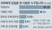 “나보다 위치가 높거나 입장이 유리한 사람에게 ‘갑질’을 당해본 적이 있다.” 한국 직장인 10명 중 9명은 ‘그렇다’고 답했다. 동아일보와 잡코리아가 지난달 22∼30일 직장인 724명을 대상으로 설문조사한 결과다. 이는 거래 관계에서 상대적 우위에 있는 ‘갑’이 권력을 남용하는 것을 뜻하는 ‘갑을 관계’가 기업 간 거래뿐 아니라 조직문화와 일상생활에서도 만연해 있음을 뜻한다. ‘갑질’을 한 사람으로는 직장상사(61.3%)가 가장 많이 꼽혔다. 납품 원청업체 등 거래처(38.3%)와 규제담당 공무원(13.8%)이 뒤를 이었다. 응답자들은 상대방이 ‘자신의 이익을 극대화하기 위해 무리한 요구를 했고’ ‘유리한 지위를 이용해 미묘한 부담을 줬다’고 답했다. 갑의 횡포는 변함이 없지만 이를 해결하기 위한 제도적 노력은 지지부진하다. 지난해 4월 대기업 임원이 여성 승무원을 폭행한 이른바 ‘라면 상무’ 사건 이후 우후죽순으로 발의된 갑을 관계 관련 법안 대부분은 아직도 국회 통과를 기다리고 있다. 국회의안정보시스템에 따르면 ‘남양유업 방지법’으로 알려진 ‘대리점 거래의 공정화에 관한 법률’ 제정안 4건은 여전히 국회에 계류 중이다. 유통대기업의 보복금지 조항 등이 담겨 있는 ‘대규모유통업에서의 거래 공정화에 관한 법률 개정안’ 5건도 마찬가지다. 전문가들은 법과 제도의 정비와 함께 우월적 지위를 남용해선 안 된다는 사회적 합의가 필요하다고 말한다. 김현수 kimhs@donga.com·권기범 기자}